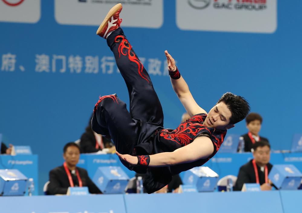 運動員完成騰空飛腳接外擺蓮接雀地龍等高難度動作前