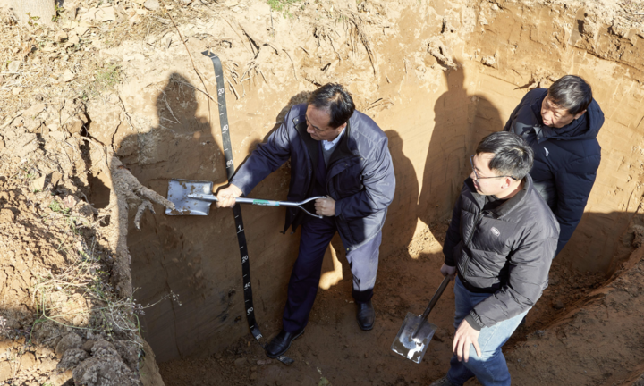 劉彥隨(左一)在挖土壤剖面進行工程技術分析。(資料圖片)