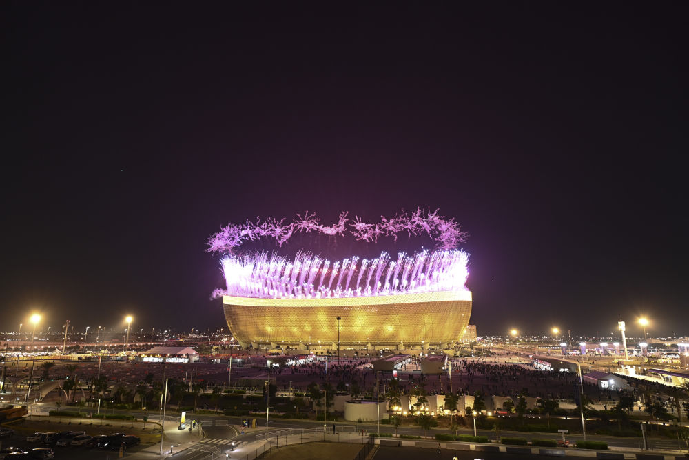這是2024年1月12日在卡塔爾首都多哈拍攝的舉行卡塔爾亞洲杯開幕式焰火表演的盧賽爾體育場。