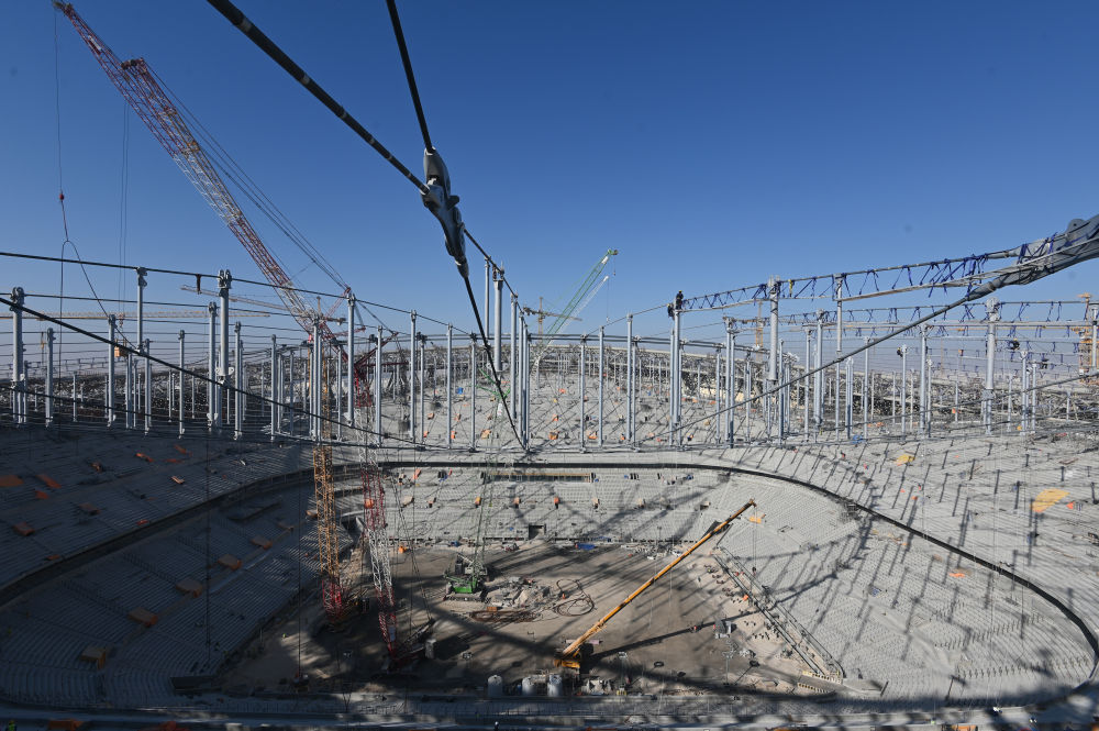 這是2021年2月13日在卡塔爾首都多哈拍攝的盧賽爾體育場屋面主體結構。