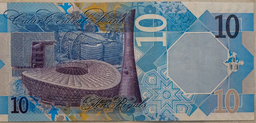 這是2025年4月17日在卡塔爾首都多哈以盧賽爾體育場為背景拍攝的卡塔爾10里亞爾紙幣,紙幣左邊圖案為盧賽爾體育場。