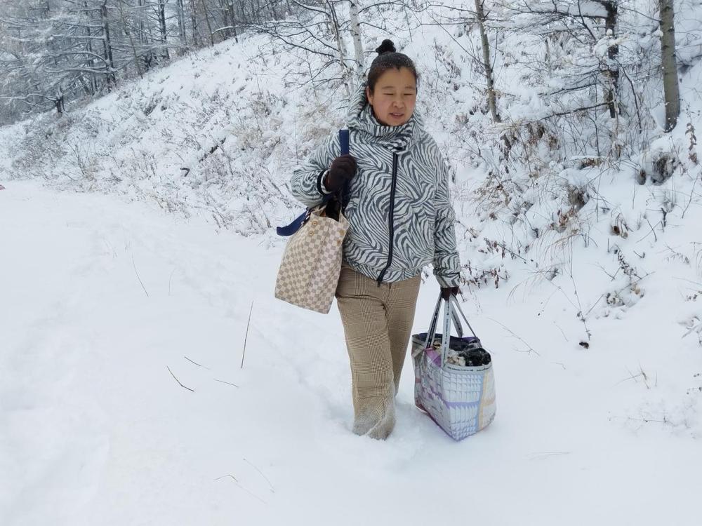 10月26日,孫忠全的妻子劉坤在摩天嶺瞭望站搬運物資。(受訪者供圖)