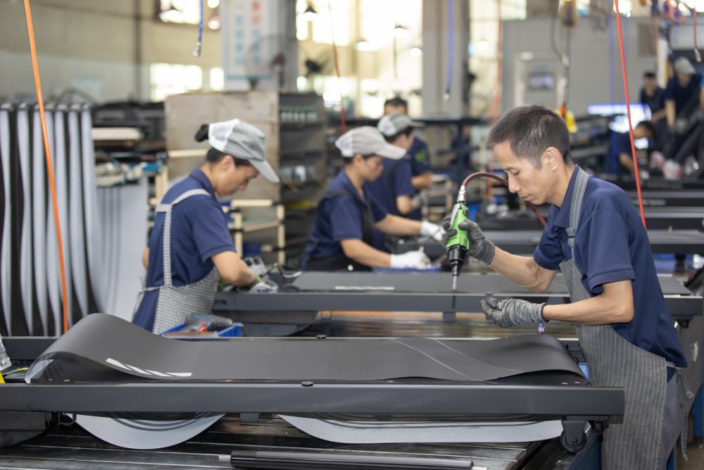 2025年9月12日,福建晉江一家體育器材工廠的工人在車間流水線上組裝跑步機。新華社發(連靜毅 攝)