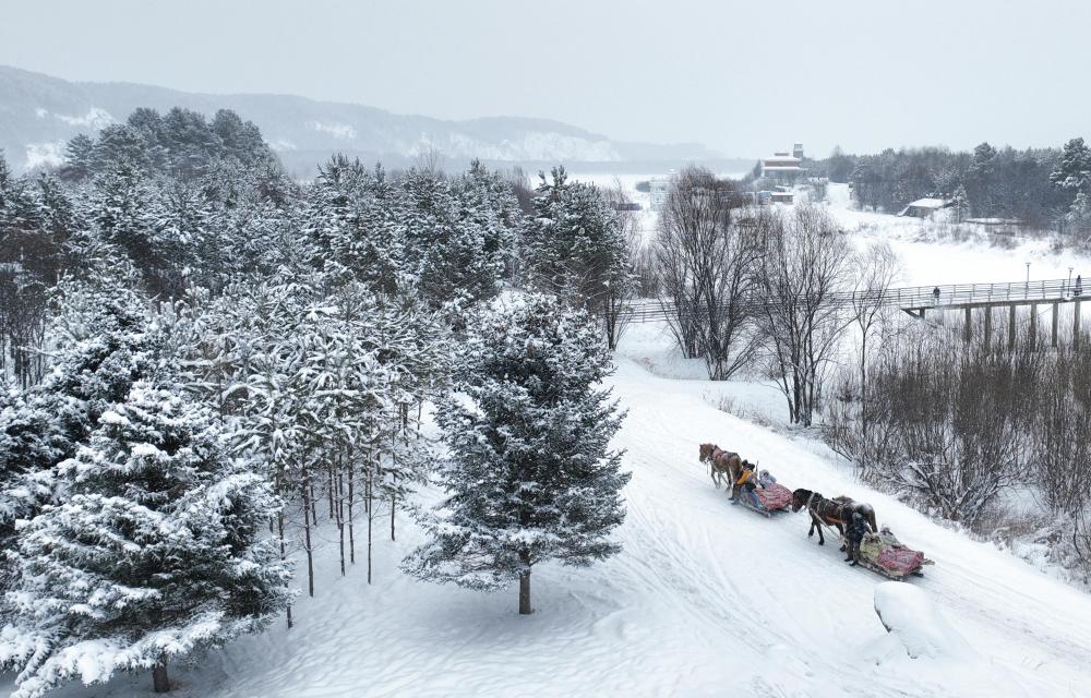 2024年11月27日,游客在黑龍江省漠河市北極村體驗馬拉爬犁項目(無人機照片)。新華社發(徐率 攝)
