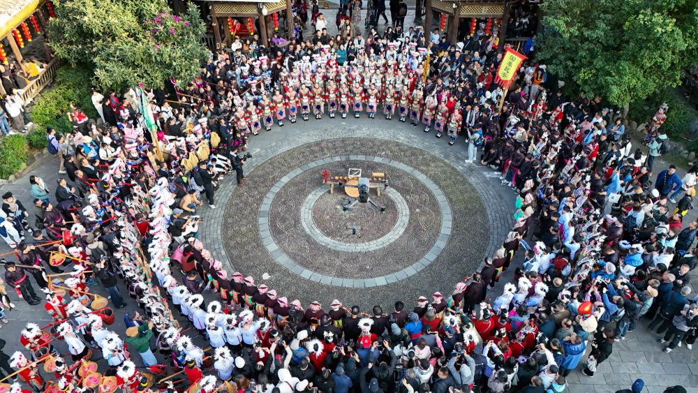 2024年11月30日,侗族群眾在貴州省黔東南苗族侗族自治州黎平縣肇興侗寨進行文藝表演(無人機照片)。新華社發(王純亮 攝)