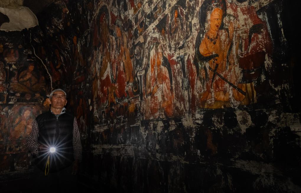 強巴次仁倚著洞口,聽著仁增旺扎的講解,瞇著眼望向那些畫。他看不太清壁畫的細節了,但半輩子的守護,已讓壁畫像是他生活的一部分——也是他所理解世界的一部分。