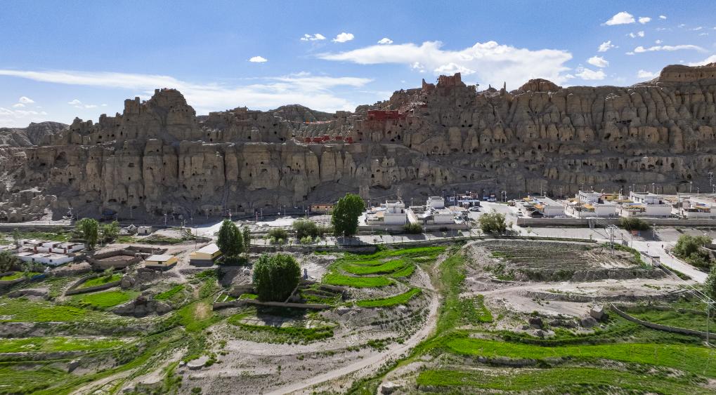 皮央石窟群與山下的村莊相互映襯(無人機照片)。新華社記者 丁增尼達 攝