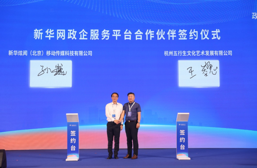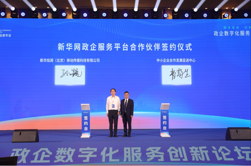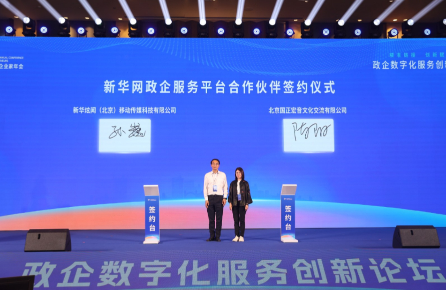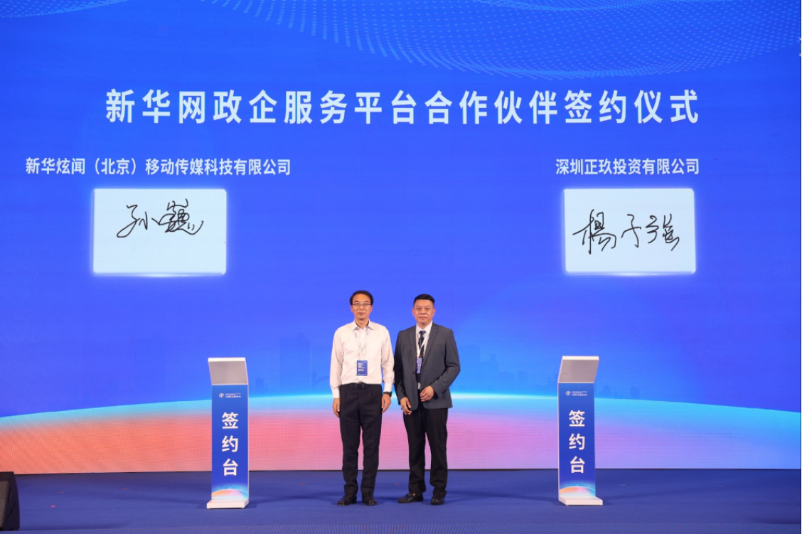 新華網政企服務平臺合作伙伴簽約儀式。新華網股份有限公司首席運營官、新華炫聞(北京)移動傳媒科技有限公司董事長孫巍分別與合作企業簽約。