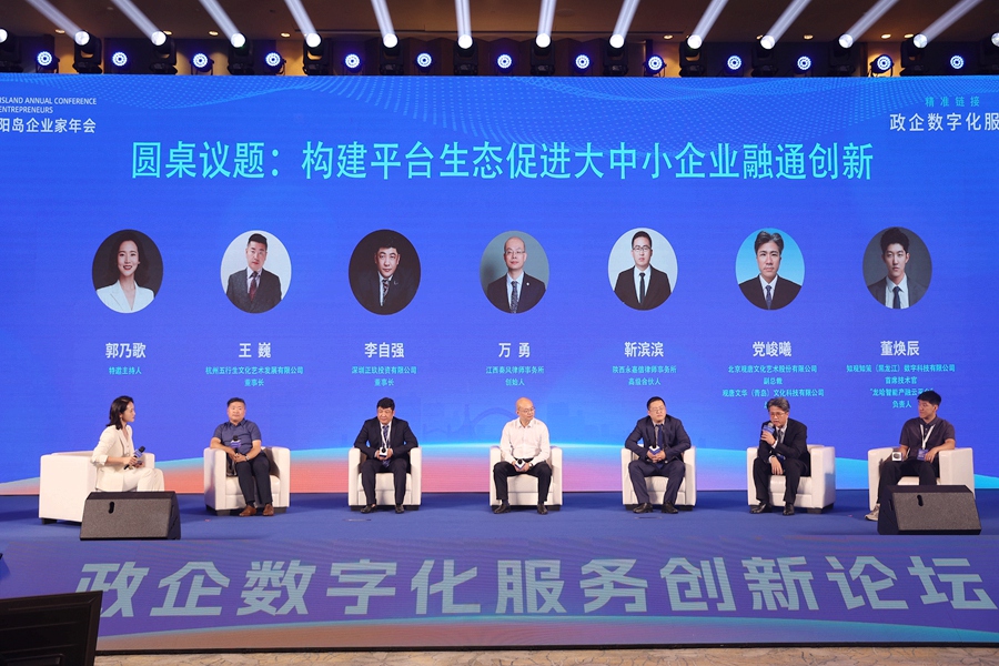 圓桌論壇環節,圍繞主題“構建平臺生態促進大中小企業融通創新”,江西秦風律師事務所創始人萬勇,陜西永嘉信律師事務所高級合伙人靳濱濱,深圳正玖投資有限公司董事長李自強,北京觀唐文化藝術股份有限公司副總裁、觀唐文華(青島)文化科技有限公司總經理黨峻曦,杭州五行生文化藝術發展有限公司董事長王巍,知觀知策(黑龍江)數字科技有限公司首席技術官、“龍哈智能產融云平臺”負責人董煥辰共同討論交流。