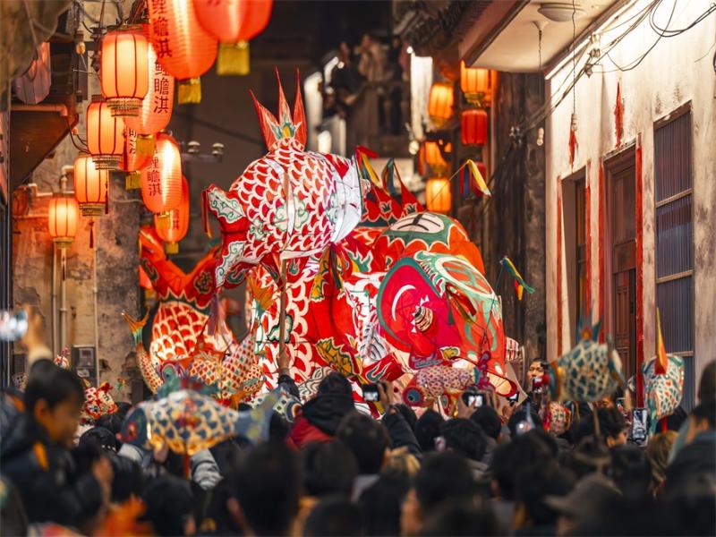 春節期間,游客在安徽歙縣北岸鎮瞻淇村觀賞魚燈巡游。(歙縣北岸鎮人民政府供圖)