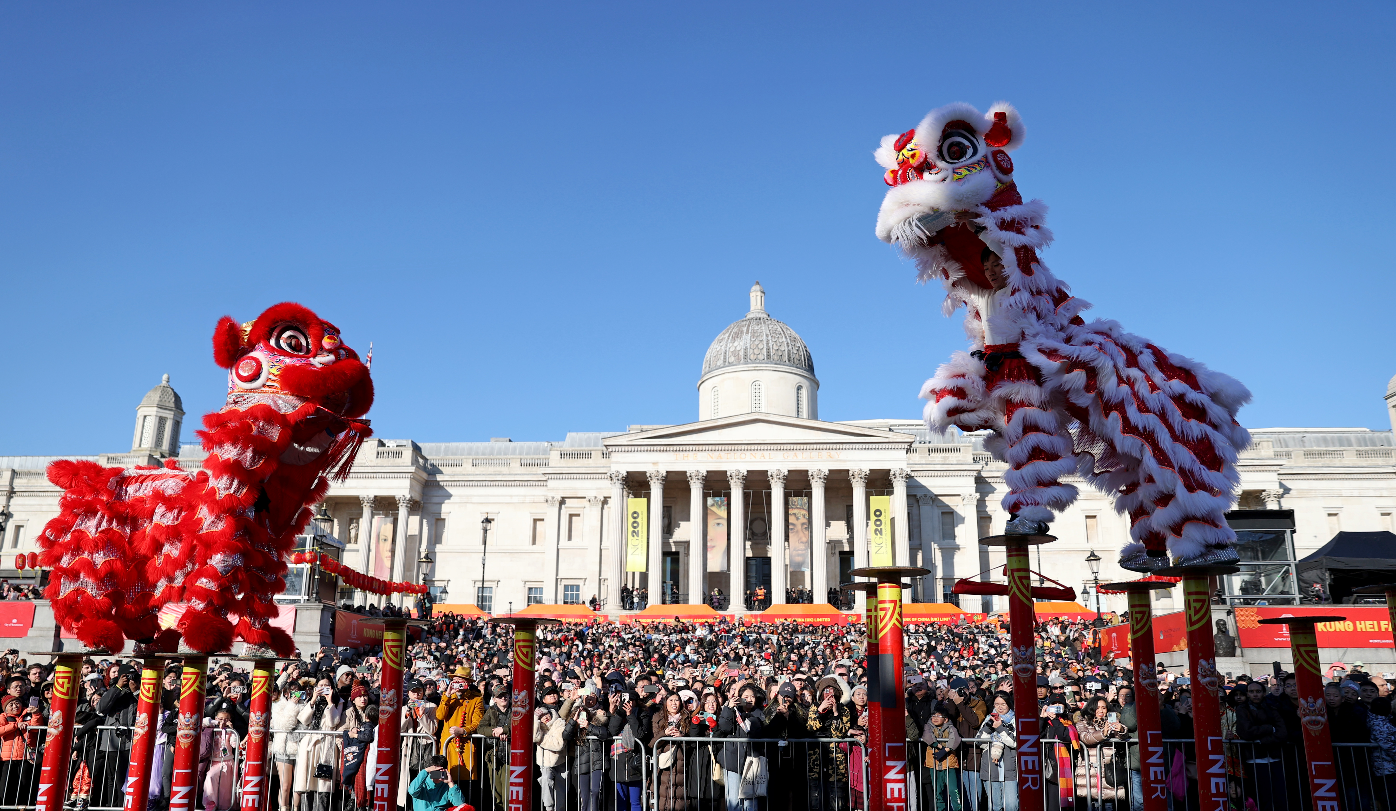 2月2日,在英國倫敦市中心的特拉法加廣場,演員表演舞獅。新華社記者 李穎 攝
