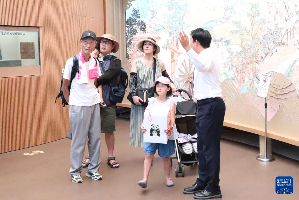 7月30日,在日本大阪世博會中國館,工作人員為中國館第100萬名參觀者淺川一家介紹中國館山東活動周展陳。新華社記者 李子越 攝