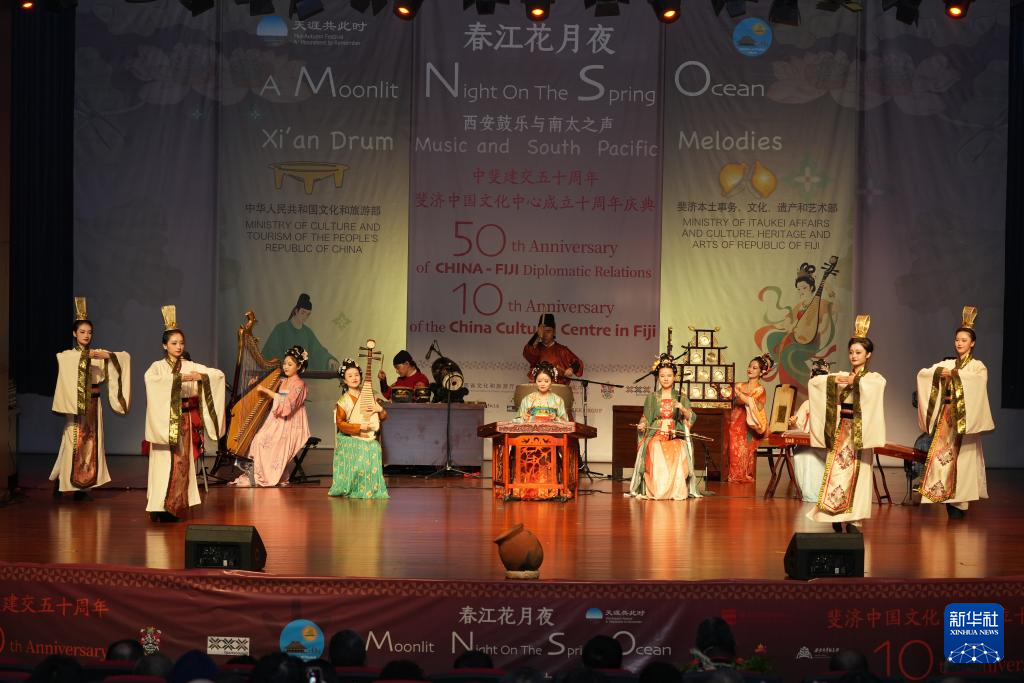 中國文化和旅游部與斐濟土著事務、文化、遺產和藝術部11日晚在斐濟首都蘇瓦共同舉辦“西安鼓樂與南太之聲”音樂會,慶祝兩國建交50周年暨斐濟中國文化中心成立10周年。中斐官員、華僑華人代表、各界友人等500余人觀看演出。