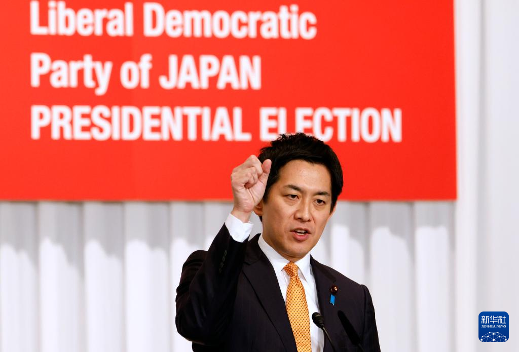 9月22日,在日本東京,日本自民黨總裁選舉候選人、前經濟安全保障擔當大臣小林鷹之在自民黨總裁選舉政見發表演講會上發言。新華社發(Pool圖片,弗蘭克·羅比雄攝)