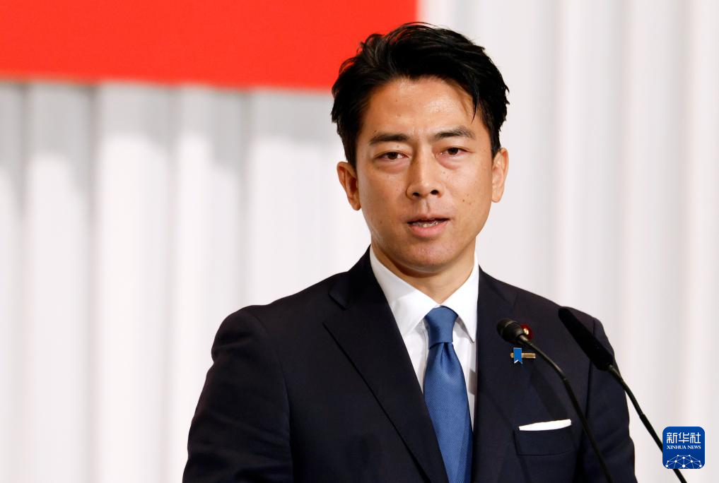 9月22日,在日本東京,日本自民黨總裁選舉候選人、農林水產大臣小泉進次郎在自民黨總裁選舉政見發表演講會上發言。新華社發(Pool圖片,弗蘭克·羅比雄攝)