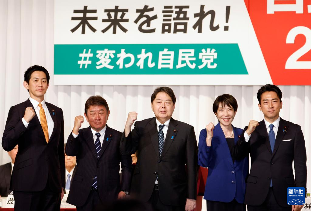 9月22日,在日本東京,日本自民黨總裁選舉候選人、前經濟安全保障擔當大臣小林鷹之、自民黨前干事長茂木敏充、內閣官房長官林芳正、前經濟安全保障擔當大臣高市早苗、農林水產大臣小泉進次郎(從左至右)在自民黨總裁選舉政見發表演講會上合影。新華社發(Pool圖片,弗蘭克·羅比雄攝)