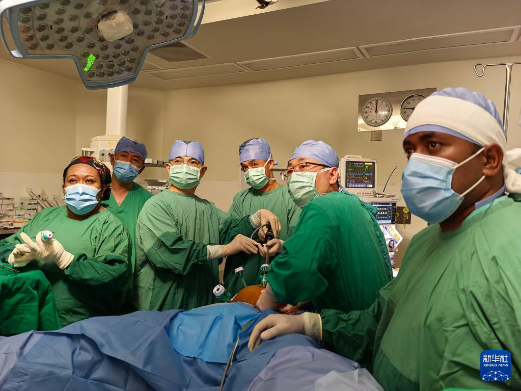 10月6日,在斐濟首都蘇瓦殖民戰爭紀念醫院,中國海軍“絲路方舟”號醫院船醫生與當地醫生為患者進行手術。