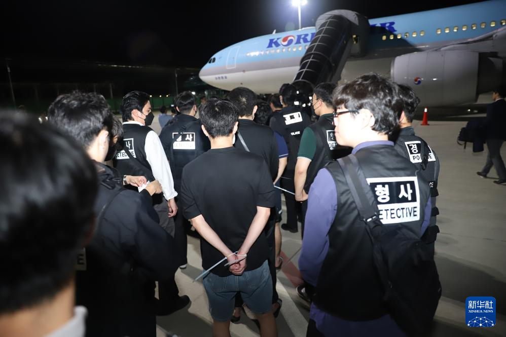 10月18日凌晨,在柬埔寨金邊德崇國際機場,警察押送被遣返的韓國網絡詐騙嫌疑人登機。