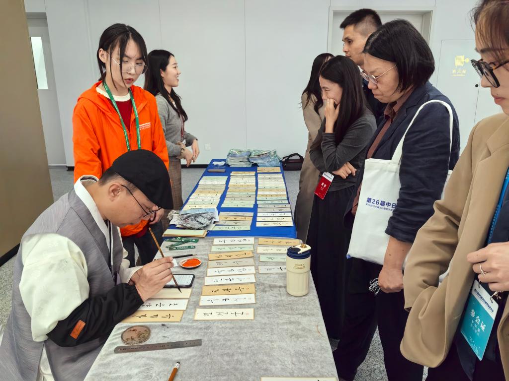 記者來到韓國文化體驗區看到,一張長桌上擺滿了寫有韓文的書簽,不少年輕的與會者駐足觀看,一名身著民族服裝的男子手握毛筆,對照著中文姓名,一筆一畫為參觀者留下姓名。不少參觀者感嘆,用毛筆寫出的韓文如此飄逸靈動。