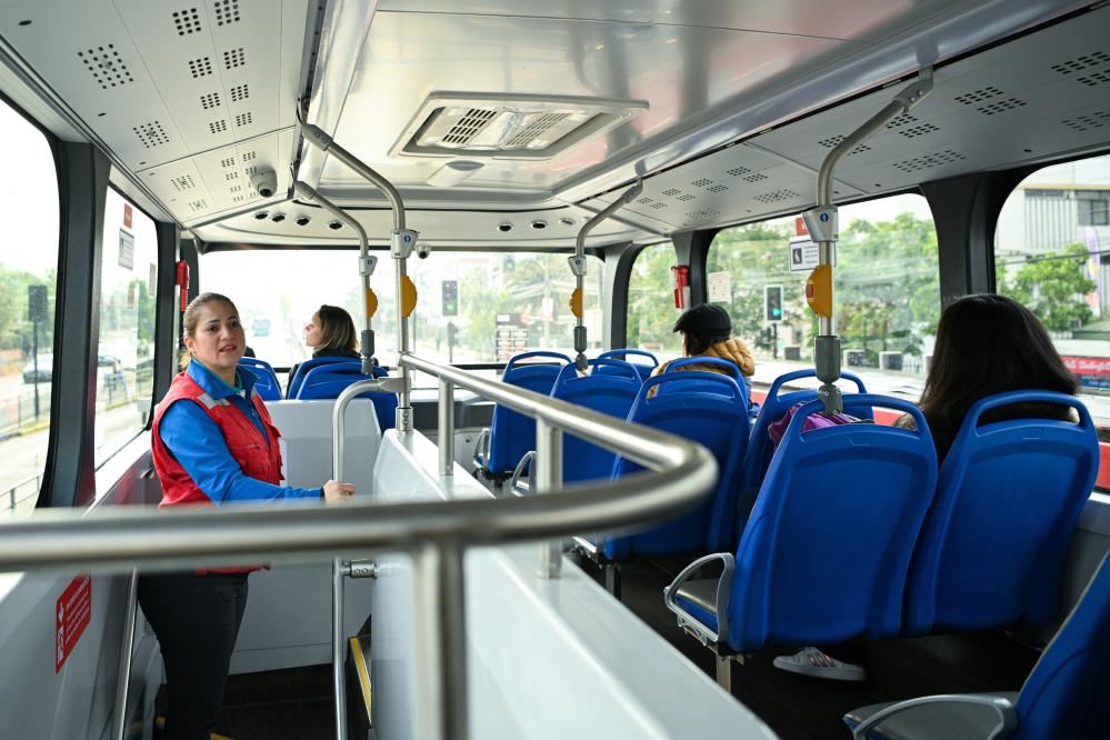 2023年11月2日,在智利首都圣地亞哥,一輛520路新能源公交車的工作人員在車內巡視。智利圣地亞哥520路公交路線是為2023泛美運動會特別開設的。新華社記者辛悅衛攝