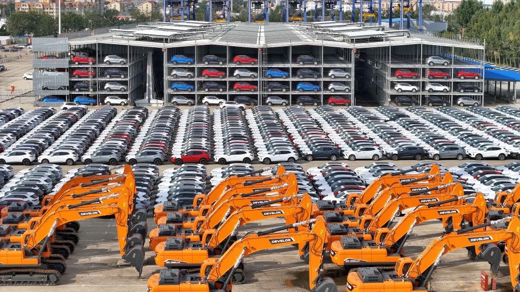 10月20日,國產汽車和工程機械在山東港口煙臺港集結等待裝船出口(無人機照片)。新華社發(唐克攝)