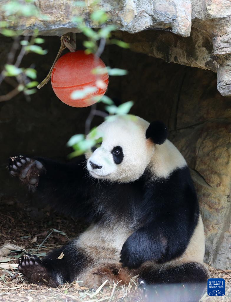 11月10日,大熊貓“怡蘭”在澳大利亞阿德萊德動物園玩耍。新華社記者 馬平 攝