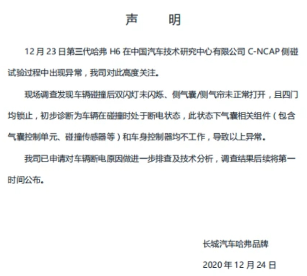 針對此碰撞結果,長城汽車給出了官方聲明,稱初步診斷為車輛在碰撞時處于斷電狀態,導致以上異常。具體內容如下: