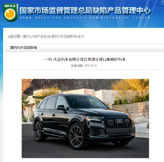 日前,一汽-大眾汽車有限公司根據《缺陷汽車產品召回管理條例》和《缺陷汽車產品召回管理條例實施辦法》的要求,向國家市場監督管理總局備案了召回計劃。決定自今日起,召回2020年7月31日至2020年8月6日生產的部分進口2021款Q7汽車,共計3輛。