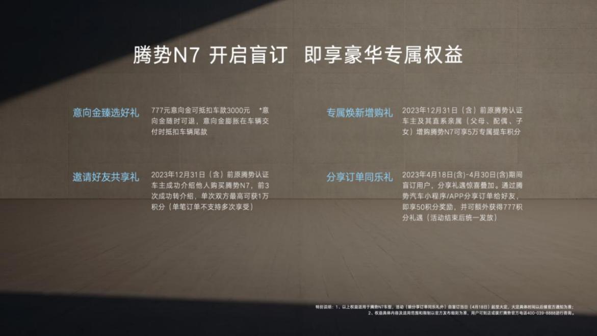 在發布會最后,趙長江宣布騰勢N7開啟盲訂,自4月18日起至大定,用戶盲訂可享意向金臻選好禮、專屬煥新增購禮、邀請好友共享禮等多重專屬權益?!膀v勢N7還將逐步發布智能底盤、智能座艙、智能駕駛三大智能技術?!壁w長江說道,對騰勢N7的全維智能化實力進行了預告。
