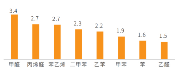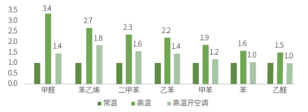 高溫模式下的揮發性有機物測評結果不如人意,濃度平均為常溫下的2倍。甲醛、乙醛、二甲苯和苯乙烯分別為常溫模式的3.8倍、1.5倍、2.3倍和2.7倍。由此可見,消費者“溫度越高,車里味道越大”的樸素感知與測試結果相符,高溫下的車內污染問題亟待解決。
