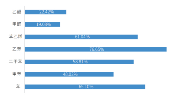 2022年度車內空氣質量測評結果顯示,常溫狀態下,除丙烯醛外,其余7種揮發性有機物均較2018-2021年有不同程度下降,一類致癌物甲醛和苯分別下降19.08%和65.10%,其余五種物質也分別有22.42%至76.65%的下降。