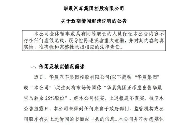 日前,華晨汽車集團控股有限公司(以下簡稱“華晨集團”)發布公告稱:近日,華晨集團關注到市場傳聞稱“華晨集團正考慮出售華晨寶馬剩余25%股份”。經公司核實,上述報道不真實。截至公告披露日,公司未得到任何來自于政府部門、監管機構或公司股東有關上述傳聞的書面或口頭的信息。公司并不知悉媒體報道所載資料的來源。為避免對投資者構成誤導,現予以澄清說明。