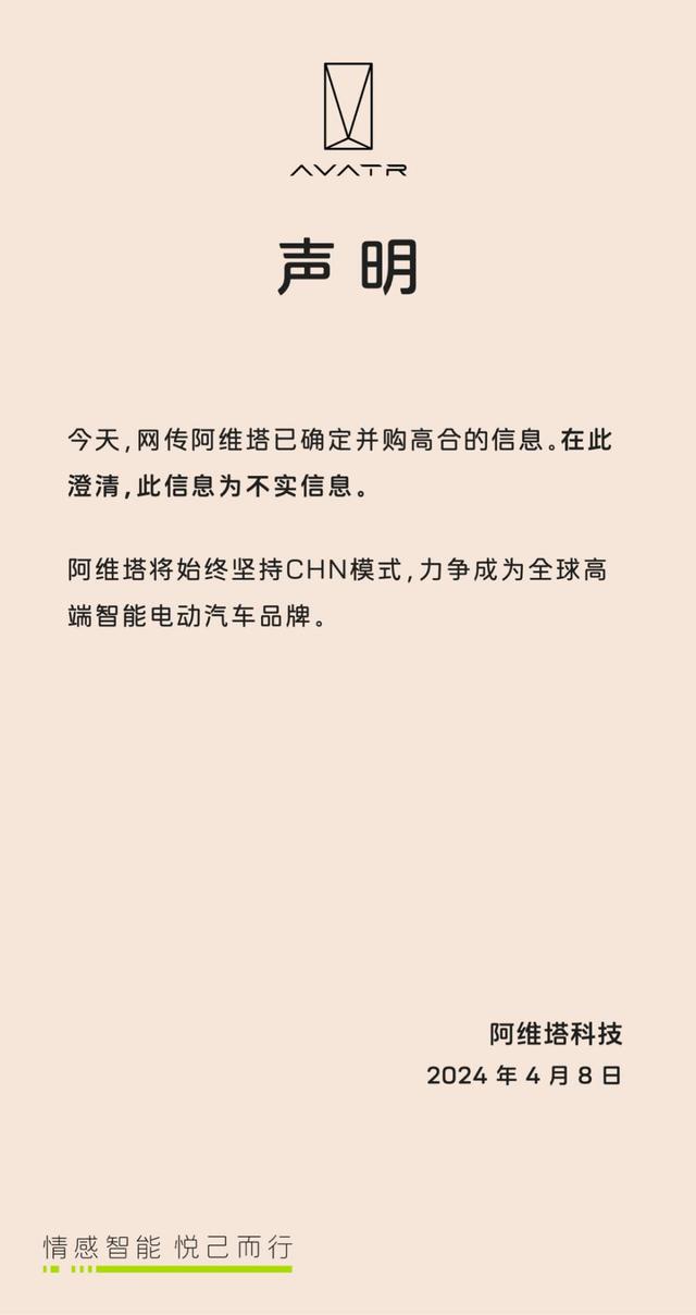 4月8日傍晚,針對網傳“阿維塔已確定并購高合汽車”的消息,阿維塔發布聲明稱:此信息為不實消息。