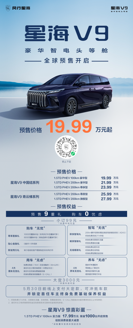 同時,風行星海V9也為下訂車主準備了豪華的“預售9重禮”大禮包。預售期即刻交付99元定金,即可享受包括【尊享置換禮】東風風行老車主置換享10000元置換補貼,其他品牌車型置換可享8000元置換補貼;【貼心金融禮】0首付1-5年低息,更有【摯友同行禮】、【即享智駕禮】、【暢享智聯禮】、【無線暢聯禮】等至誠至意的購車政策,保障準車主們購車無憂、智駕無憂、用車無慮、養車無慮。5月30日前線上支付3000元大定款,可沖抵車款,并鎖定首任車主終身免費基礎保養權益,讓用戶輕松享受購車的高品質體驗與服務。值得一提的是,東風風行還給用戶帶來驚喜彩蛋,限量預售1000臺1.5TD PHEV 100km實力版車型,預售價只需17.99萬元。