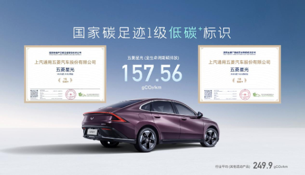 五菱星光插混榮獲首批國家“碳足跡1級低碳+”標識認證,全生命周期碳排放量僅為157.56gCO?/km,優于行業混動產品平均的249.9 gCO?/km。