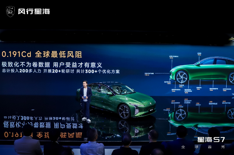 據介紹,風行星海投入200多人研發團隊,共打磨了20余輪超300個優化方案,經過100多小時風洞試驗測試與驗證,最終在輪轂、3D阻風板、前格柵進氣口等十三個部位分別降低0.001-0.016Cd風阻,最終達成了星海S7在開發驗證過程做到的最低風阻0.191Cd。