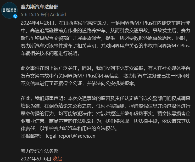 5月6日,賽力斯汽車法務部發文,山西問界M7交通事故后,有人在社交媒體平臺發布有關不實信息,賽力斯汽車法務部已向公安機關報案。