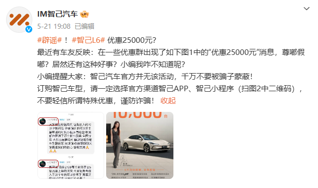 5月21日,@IM智己汽車 發文稱,最近有車友反映,在一些優惠群出現了“智己L6優惠25000元”的消息,智己汽車官方并無該活動。