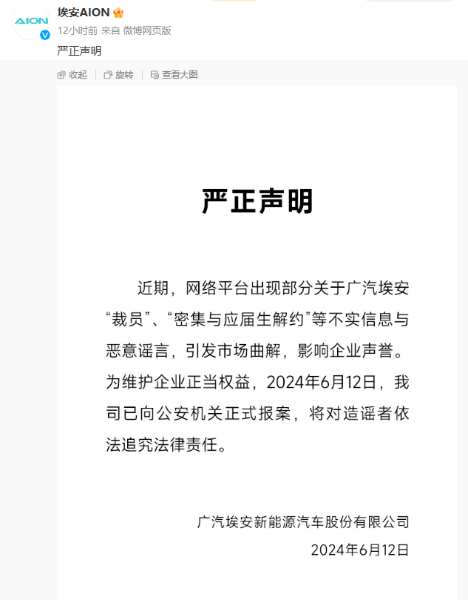 廣汽埃安在聲明中表示,為維護企業正當權益,2024 年6月12日,已向公安機關正式報案,將對造謠者依法追究法律責任。