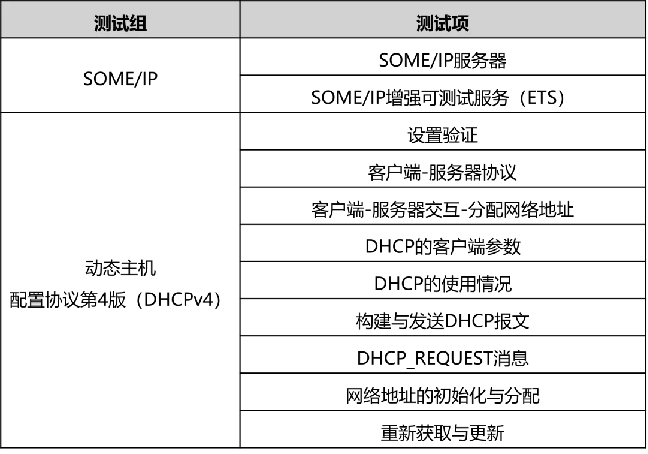 ISO21111-11標準包含車載以太網應用層到會話層的一致性測試規程。通過指定應用層SOME/IP協議與會話層中動態主機配置協議版本4(DHCPv4)的測試系統拓撲結構以及相關CTC配置內容的具體說明,實現從應用層到會話層一致性測試工作的標準化。
