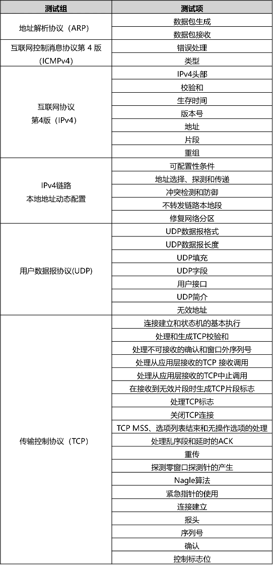 ISO21111-10標準聚焦于網絡層與傳輸層的一致性測試規程,涵蓋了車載以太網中網絡層與傳輸層的協議。其中,網絡層包含地址解析協議(ARP)、互聯網控制消息協議第4版(ICMPv4)、互聯網協議第4版(IPv4)以及IPv4鏈路本地地址的動態配置等一系列測試組。傳輸層測試規程包括用戶數據報協議(UDP)和傳輸控制協議(TCP)相關用例。