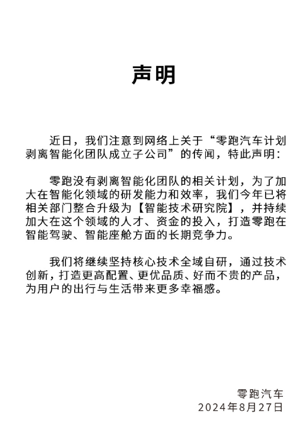 8月27日,針對上述傳聞,零跑汽車發布官方聲明進行辟謠。聲明顯示,零跑沒有剝離智能化團隊的相關計劃,為了加大在智能化領域的研發能力和效率,零跑汽車今年已將相關部門整合升級為智能技術研究院。