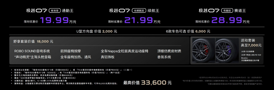 上市當日起至2024年9月30日24點前購車,并在2025年1月31日前提車的用戶,還可獲得每年1500度電卡3年使用權或7kW直流家庭充電樁服務包、整車及三電系統終身質保、終身免費道路救援、ASD高階智駕3個月免費體驗、復購權益等,最高總價值可達33,600元。