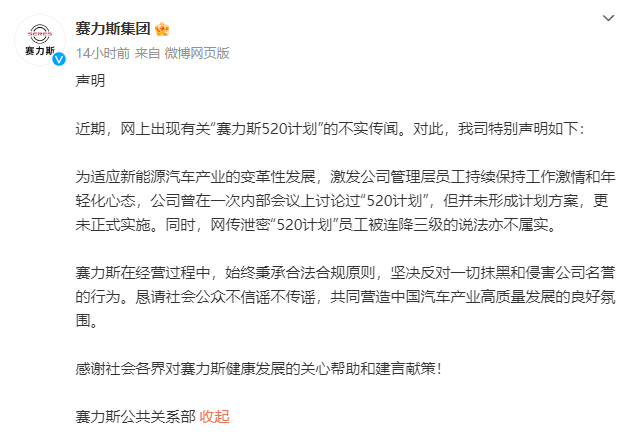 賽力斯在聲明中表示,為適應新能源汽車產業的變革性發展,激發公司管理層員工持續保持工作激情和年輕化心態,公司曾在一次內部會議上討論過“520計劃”,但并未形成計劃方案,更未正式實施。同時,網傳泄密“520計劃”員工被連降三級的說法亦不屬實。