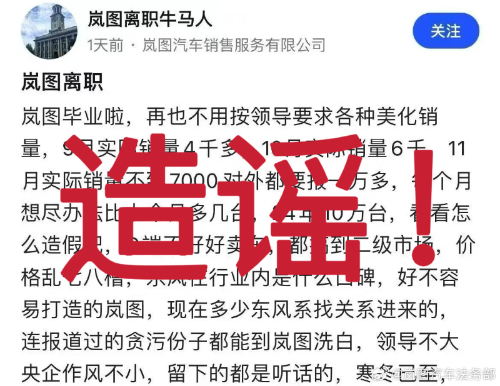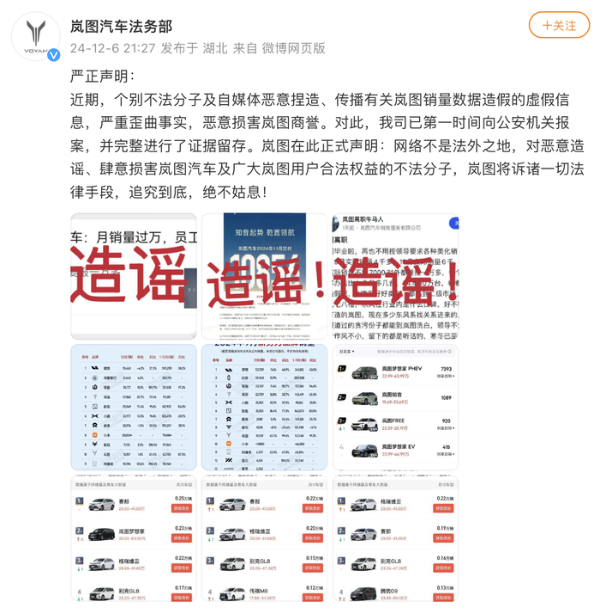 12月6日晚,嵐圖汽車法務部通過社交媒體發布聲明,就網傳信息進行辟謠。