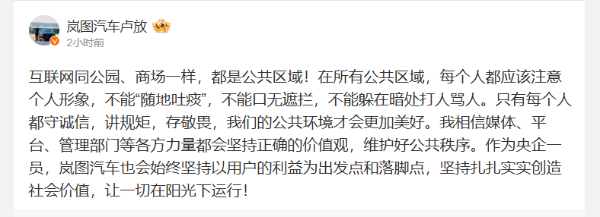 7日,嵐圖汽車CEO盧放通過社交媒體表示,“互聯網同公園、商場一樣,都是公共區域!在所有公共區域,每個人都應該注意個人形象,不能口無遮攔,不能躲在暗處打人罵人。只有每個人都守誠信,講規矩,存敬畏,我們的公共環境才會更加美好?!薄白鳛檠肫笠粏T,嵐圖汽車也會始終堅持以用戶的利益為出發點和落腳點,堅持扎扎實實創造社會價值,讓一切在陽光下運行!”