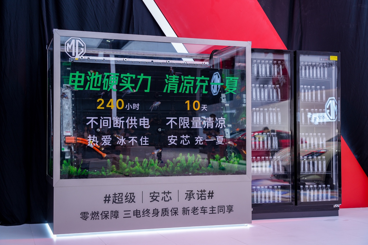 除了重磅新車發布之外,上汽MG名爵展臺更是創意滿滿。夏日酷熱難消,冰飲無疑是消暑之選,上汽MG名爵展臺為大家準備了清涼的飲料供大家解暑。大家在享受到清涼的同時,驚奇的發現飲料柜的“能量之源”竟然源自一塊在水中浸泡的電池。這就是上汽MG名爵的獨門絕技——“零燃電池”,即便被水浸泡也依然能夠穩定為飲料柜提供源源不斷的電力,眾多觀眾紛紛拿起手機,記錄下了這“神奇“的一幕,在暢享清涼的同時,還能直觀的了解上汽MG名爵“零燃電池”的黑科技以及“超級安芯承諾”的無畏勇氣。承載著MG“無懼歐盟關稅、出海步履不?!睉B度的38.1周邊互動區域,也是創意十足,極具互動性,引得眾多參展觀眾前來打卡。