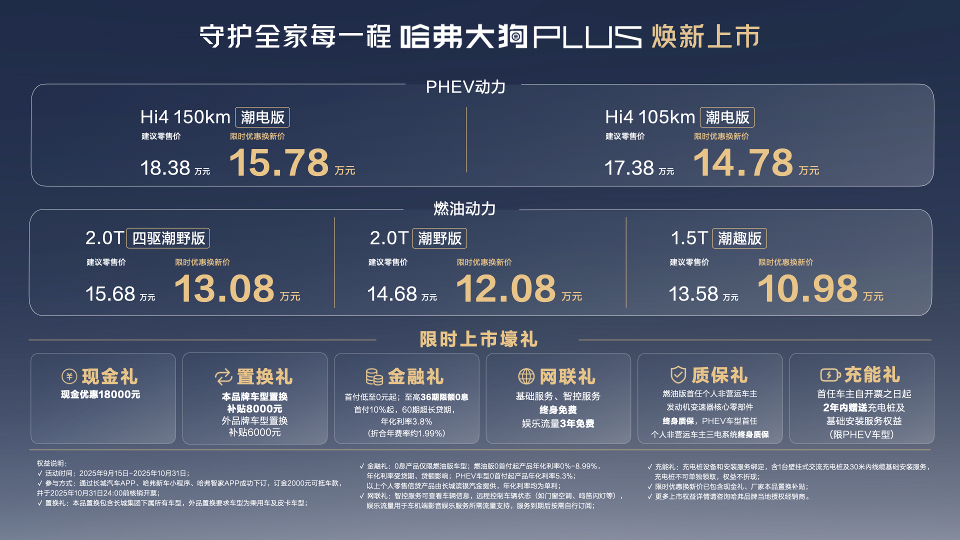 此外,在9月15日-10月31日期間購買哈弗大狗PLUS,還能獲得包括現金禮、置換禮、金融禮、網聯禮、質保禮、充能禮在內的六重限時上市壕禮,首付低至0元起,基礎服務、智控服務終身免費,娛樂流量3年免費,燃油版首任車主核心零部件終身質保、PHEV版首任車主三電系統終身質保,以及2年內為首任PHEV車主贈送充電樁及基礎安裝服務,覆蓋購車、用車、養車全周期。
