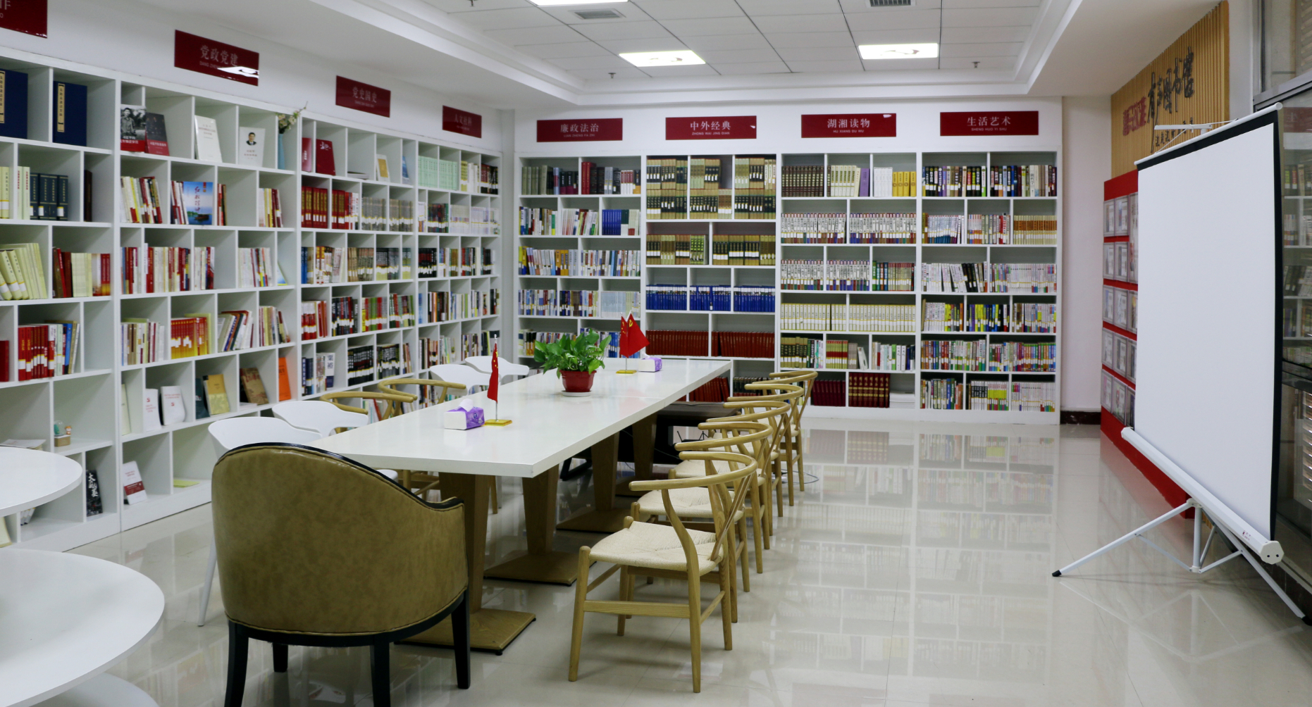 岳陽縣人民檢察院共有內設科室8個,派駐檢察室1個,專項政法編制57個,在職干警48人。在職中共黨員38人,黨員人數(含老干)占單位總人數的86.8%。岳陽縣人民檢察院的黨建學習書屋,集線上線下閱讀、讀后交流、活動籌備及展示于一體,為干警提供了優渥的讀書條件,營造了濃厚的讀書氛圍,是打造“書香型檢察院、學習型檢察干部”的有力支撐。書屋建設面積100㎡,藏書數量3500余冊,共分閱讀學習區、有聲讀物區、黨建文化區、學習強國區、文創生活區、智能借閱區、留言墻和水吧服務區8個功能區,配有耳機互動點播屏、黨建AI學習音箱等智能閱讀設備,并與喜瑪拉雅有聲圖書館聯合打造的有聲閱讀平臺等。書屋有嚴格的《書屋管理制度》和《書屋借閱制度》,由專人負責管理。自2020年10月改建投入使用以來,已承辦學習強國知識競賽2場,黨員志愿者服務活動籌劃5次,政法隊伍教育整頓“跟班先進找差距”活動2場,黨課“微宣講”5場,并作為黨建工作的有益探索向岳陽縣各支部推廣,得到了領導、同事的肯定。