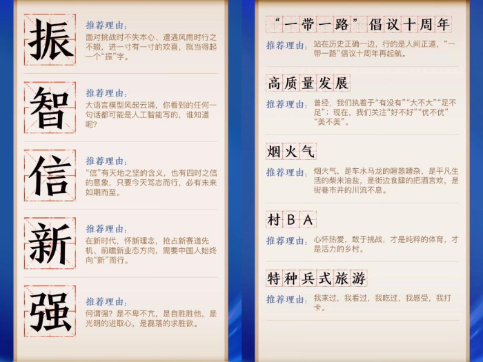 前五位年度國內候選字為“振”“智”“信”“新”“強”,前五位年度國內候選詞為“‘一帶一路’倡議十周年”“高質量發展”“煙火氣”“村BA”“特種兵式旅游”;前五位年度國際候選字為“?!薄靶尽薄皯稹薄罢劇薄昂恕?,前五位年度國際候選詞為“戰爭”“ChatGPT”“核污染水”“芯片”“巴以沖突”。